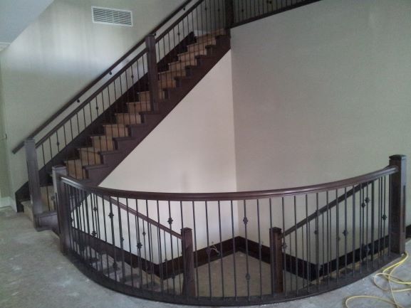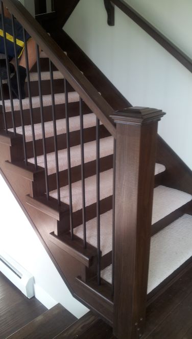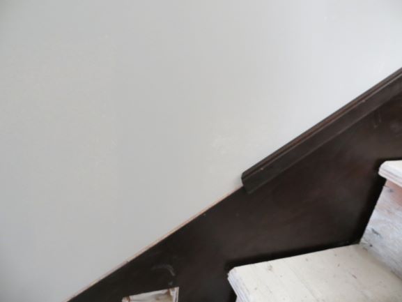 Wall ends are finishing boars with edge molding placed on treads against a wall. The come in 4, 5 or 6 inch width to match the post sizes.